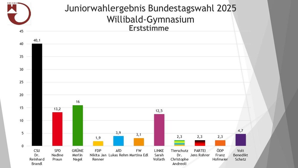 Das Erst- und Zweitstimmenergebnis des Willibald-Gymnasiums kann den beiden Grafiken entnommen werden.