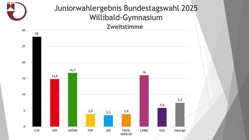 Der Wahltag des Willibald-Gymnasiums fand am 10. Februar statt. Wahlberechtigt waren alle Schülerinnen und Schüler, auf deren Stundenplan in diesem Schuljahr das Fach Politik und Gesellschaft steht. Von den insgesamt 306 Wahlberechtigten gaben 264 ihre Stimme ab, was einer Wahlbeteiligung von 86,27% entspricht. Diese rege Beteiligung war sehr erfreulich. Ein herzlicher Dank geht an die Lehrkräfte, die Unterrichtszeit für die Durchführung der Wahl zur Verfügung stellten.