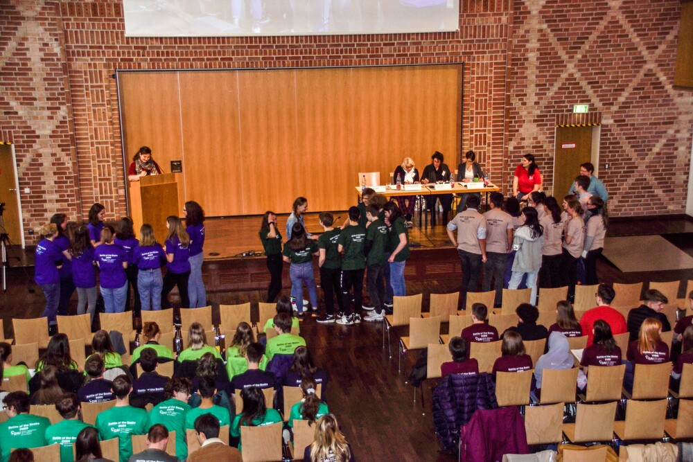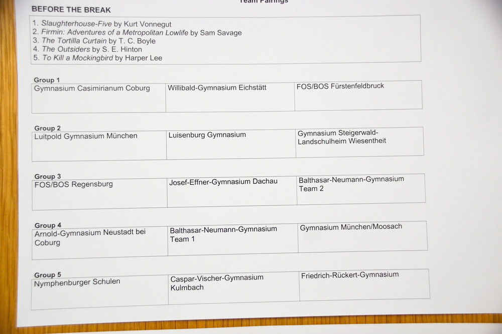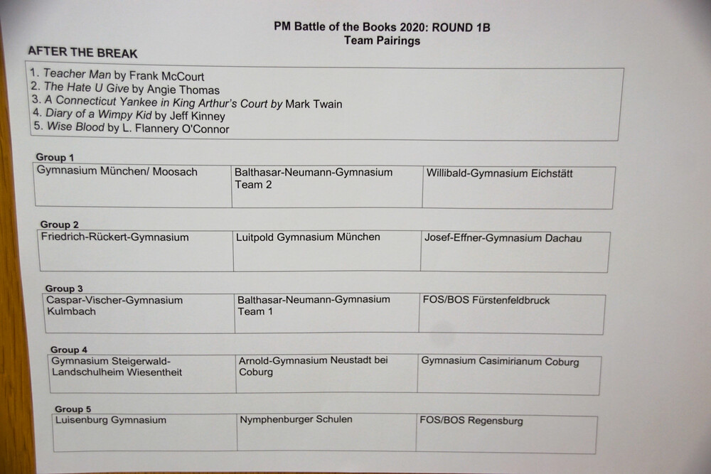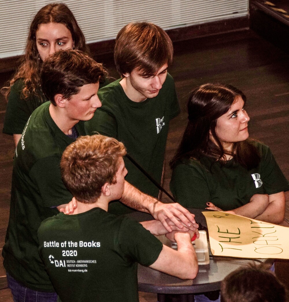 Seit nunmehr zwölf Jahren lädt das Deutsch-Amerikanische Institut in Nürnberg Schulen aus ganz Bayern zur „Battle of the Books“ nach Nürnberg. In diesem Jahr haben sich insgesamt 30 Teams von jeweils mindestens 10 Schülerinnen und Schülern angemeldet. Alle Gruppen müssen sich auf insgesamt 10 Bücher der amerikanischen Literatur so gut vorbereiten, dass sie möglichst viele Punkte für das richtige Beantworten der Detailfragen sammeln können. In diesem Jahr standen folgende Bücher auf der Literaturliste:
