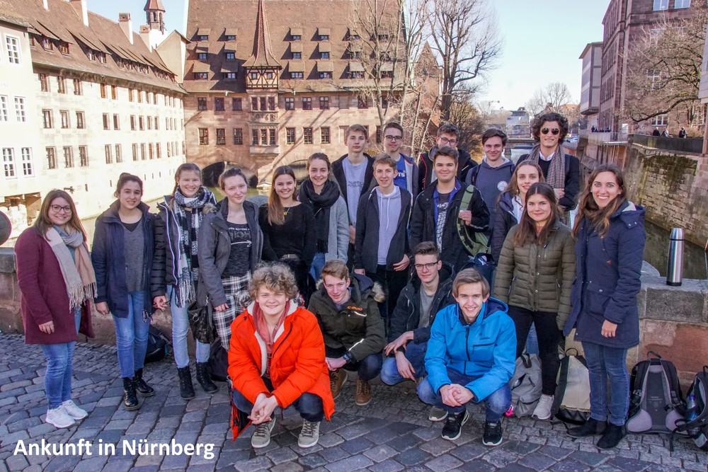 Am 27. Februar begleiteten vier Personen die Gruppe nach Nürnberg. Drei waren schon ab Eichstätt mit von der Partie: Simone Kaiser und Franz Hocheder als begleitende Lehrkräfte und Sophie Riedl, die 2018 am Willibald-Gymnasium ihr Abitur absolvierte und bis dahin mehrfach an dem Wettbewerb in Nürnberg teilgenommen hatte. In Nürnberg erwartete uns am Bahnhof Kim Rychly, die eine Woche zuvor an ihre Stammschule in Nürnberg zurückgekehrt war und sich immer noch mit dem Willibald-Gymnasium verbunden fühlt. Im Sommer 2018 hatte sie die „Battle-of-the-Books“- Gruppe (Mittelstufe) mit nach Nürnberg begleitet und wollte nun sehen, wie der Wettbewerb bei der Oberstufe abläuft.
