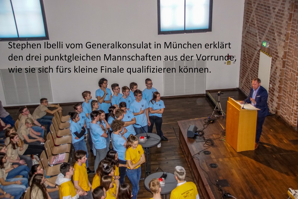 Die Oakies waren am Nachmittag am Start, zusammen mit 19 anderen Schulen aus ganz Bayern. Nach der Begrüßung durch den Leiter des Deutsch-Amerikanischen Instituts und den Stadtkämmerer von Nürnberg konnte die 1. Wettkampfrunde beginnen, bei der die 20 Schulen in 5 Vierergruppen aufgeteilt waren. Die Oakies kämpften also gegen drei andere Schulen. Jede Schule schickte 10 Schülerinnen und Schüler nach vorne, wo sich jede Schule um einen der Tische, auf denen ein Buzzer stand, versammelte. Zu fünf der insgesamt 10 Bücher stellte nun Stephen Ibelli vom Generalkonsulat München jeweils drei Fragen. Häufig konnte er die Frage gar nicht bis zu Ende vorlesen, weil schon jemand die Antwort wusste und den Buzzer gedrückt hatte. Für die späteren Sieger vom Josef-Effner-Gymnasium aus Dachau war das alles so überraschend, dass sie in der ersten Runde nur 55 Punkte errangen.