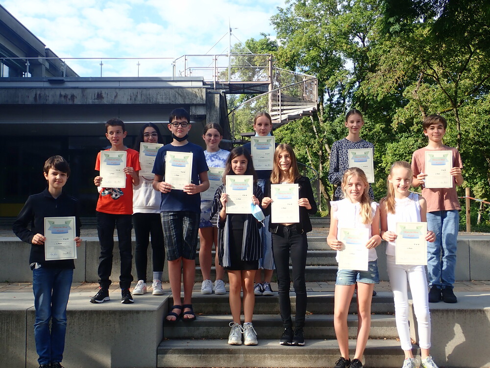 Bei beiden Wettbewerben spielten jeweils drei Gruppen gegeneinander, die sich aus SchülerInnen der Englischklassen zusammensetzten. Diese Bücherschlachten fanden im Raum 214/215 statt. Die ZuschauerInnen waren die SpielerInnen, die gerade nicht an den drei Buzzern um die Punkte kämpften. Nach der Begrüßung wurden die ersten drei KandidatInnen zu den Buzzern gebeten. Sie hatten alle das gleiche Buch vorbereitet (z.B. „L ate Again“) Nachdem sie sich etwas mit den Buzzern vertraut gemacht hatten, ging es mit den Fragen los, und sobald jemand glaubte, die Antwort zu kennen, drückte er/sie auf den Buzzer, der blau aufleuchtete und ein Geräusch von sich gab. Damit hatte man das Antwortrecht erwirkt. Allerdings hörte der Moderator beim Aufleuchten eines Buzzers mit dem Vorlesen der Frage auf, selbst wenn er sie erst zur Hälfte vorgelesen hatte. Doch hatten viele der TeilnehmerInnen ihr Buch derart genau studiert, dass sie häufig schon sehr früh die Buzzer betätigten, um auf jeden Fall das Antwortrecht zu bekommen. War die Antwort falsch, gab es keinen Punkt, und die beiden verbleibenden Kandidaten konnten nun unter sich ausmachen, wer den Punkt erhalten sollte, natürlich wieder mit Vorlesen der Frage – vielleicht auch dann der ganzen Frage – und dem Betätigen des Buzzers. Schwierig wurde das Punktesammeln, wenn bei einem Buch zwei oder gar alle drei WettbewerberInnen ähnlich schnell mit den Buzzern und den richtigen Antworten waren. Dann nahmen sie sich häufig die Punkte gegenseitig ab. Einige kehrten mit sehr wenigen Punkten an ihre Plätze zurück, obwohl sie fast jede Frage richtig hätten beantworten können. Doch waren sie beim Drücken des Buzzers einfach einen Tick zu langsam. Aus Sicht des Moderators hatten alle die Bücher gut gelesen, ein paar der TeilnehmerInnen hatten ihre Lektüren allerdings nahezu vollständig verinnerlicht, sodass man fast ungläubig den präzisen Antworten lauschte. Wegen dieser tollen Leistungen haben alle unsere Anerkennung und eine Urkunde verdient und diese auch mit der Zeugnisausgabe erhalten. Leider war nicht sehr viel Zeit, um noch Fotos zu machen. Daher nur ein Bild, auf dem fast nur die Sieger der Bücherschlacht der 6. Klassen zu sehen sind. Vielleicht gibt es ja im neuen Schuljahr noch einen Nachtrag, bei dem noch ein paar Fotos folgen.