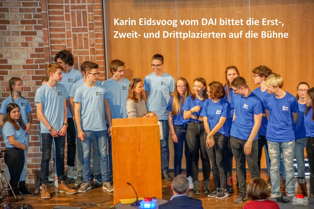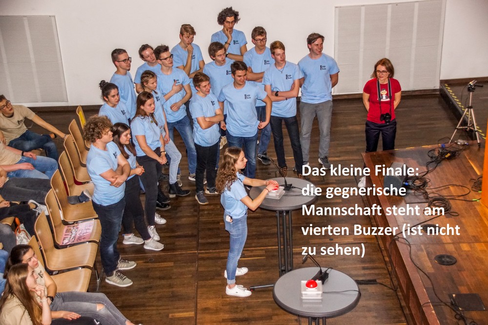 Für die zweite Runde, bei der nun Fragen zu den verbleibenden Büchern gestellt wurden, hatte man die Schulen neu verteilt, so dass die Oakies nun gegen drei andere Schulen antraten. Mit einem Gesamtergebnis von 210 Punkten nach zwei Runden, hatte sich unsere Schule noch nicht ganz für die Finalrunde qualifiziert. Die zwei bestplazierten Schulen kämpften um den Sieg: Friedrich-Alexander-Gymnasium aus Neustadt a.d. Aisch (340 Punkte) und Josef-Effner-Gymnasium aus Dachau (275 Punkte). Für den Kampf um den dritten Platz, das kleine Finale, gab es drei Aspiranten, die alle genau 210 Punkte gesammelt hatten: Staatliche FOS/BOS Regensburg; Nymphenburger Schulen aus München und das Willibald-Gymnasium aus Eichstätt. Es durften aber nur zwei Schulen am kleinen Finale teilnehmen. Per Los wurde entschieden, dass sich die „Oakies“ mit einer der beiden anderen Schulen in einem zusätzlichen Zweikampf messen sollten. Der Sieger aus diesem Wettstreit durfte dann um Platz drei kämpfen. Im Unterschied zur Vorrunde durfte jetzt nur immer ein Mitglied der Gruppe an den Buzzer treten. Es wurde nur eine Frage gestellt. Wer sie richtig beantwortete bekam einen Punkt. Wenn niemand die Antwort wusste, wurde eine weitere Frage nachgeschoben. Bei einer falschen Antwort gab es ebenfalls eine neue Frage. Sobald der Punkt vergeben war, trat das nächste Mitglied der Gruppe an den Buzzer und die Frage ging über das nächste Buch. Insgesamt waren damit bei 10 Büchern 10 Punkte zu vergeben. Die Oakies konnten sich zunächst durchsetzen und damit ins kleine Finale einziehen. Dort waren sie nochmals erfolgreich und ergatterten somit einen hervorragenden dritten Platz. Es folgte noch die Siegerehrung, zu der auch die Oakies auf die Bühne gebeten wurden. Anschließend ging es im Eilschritt zurück zum Bahnhof, wo wir den Zug nach Treuchtlingen versäumten und etwas später über Ingolstadt nach Eichstätt fuhren, um gerade noch rechtzeitig zur Faschingsrevue an der Schule einzutreffen.
