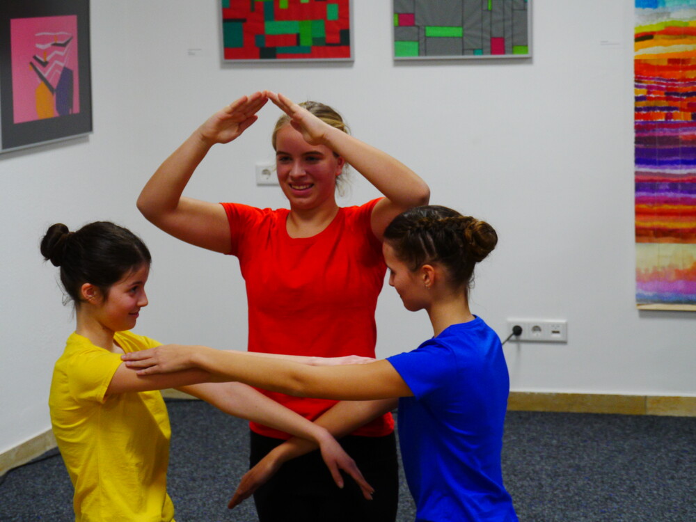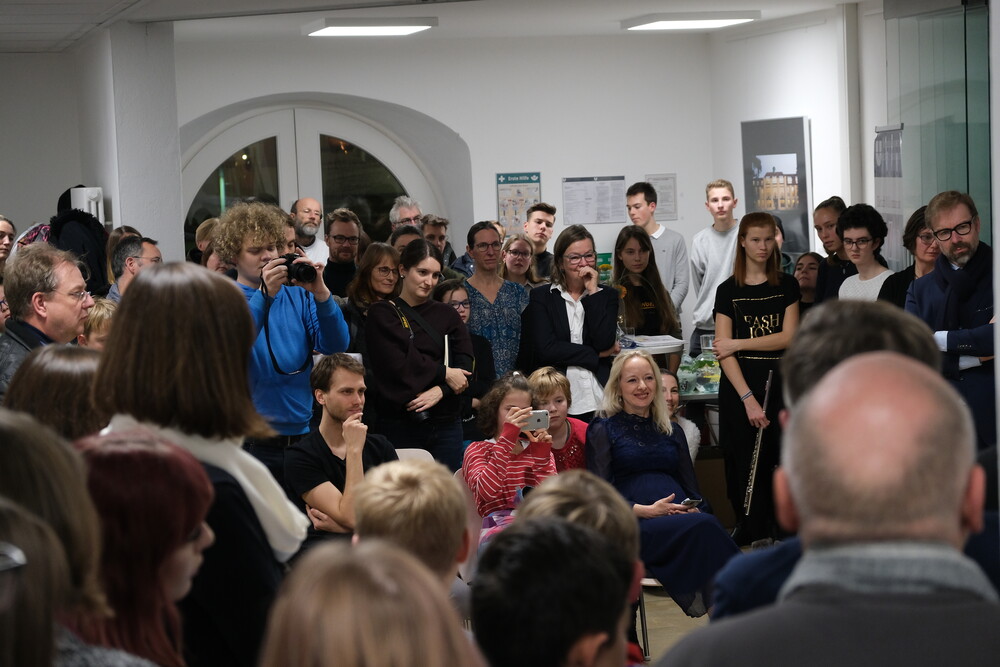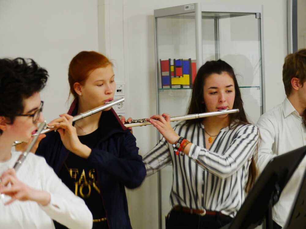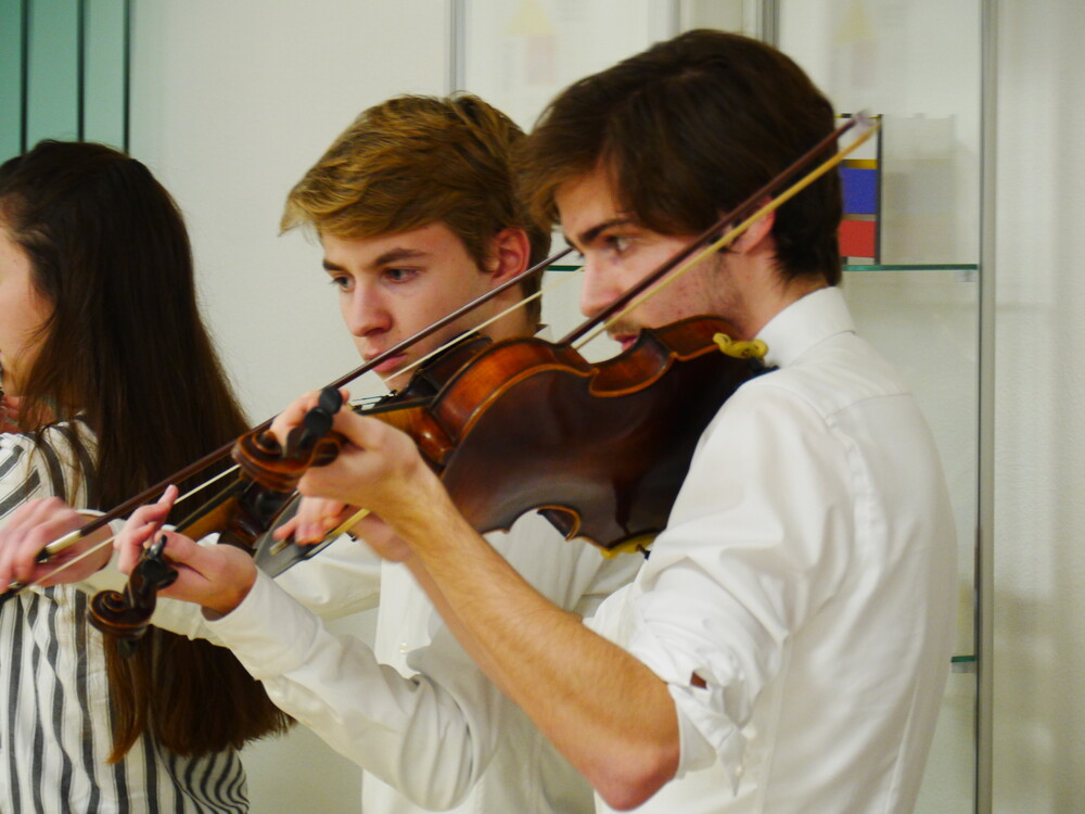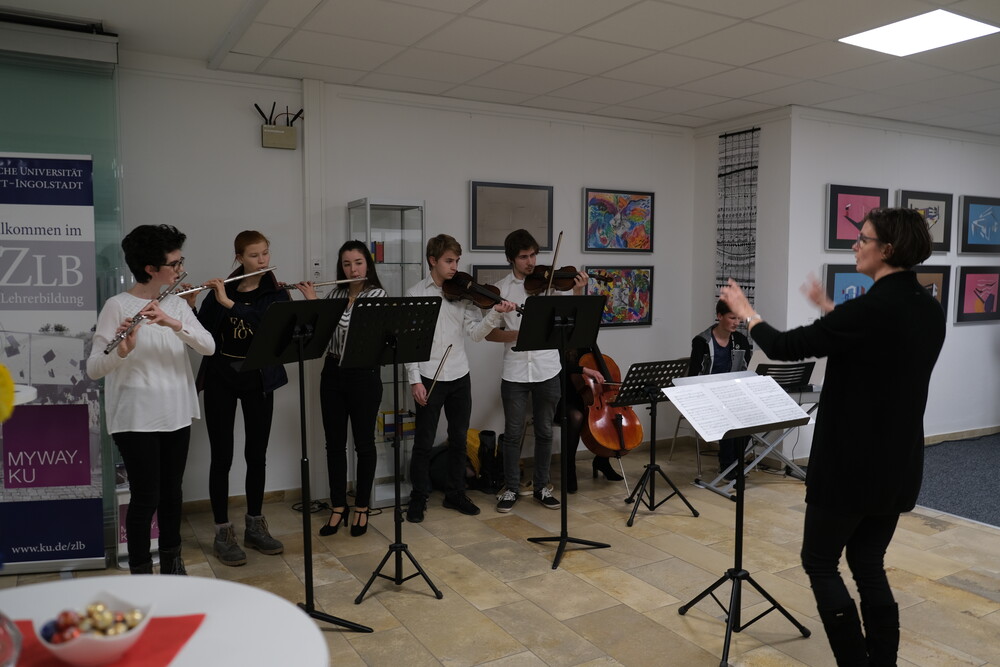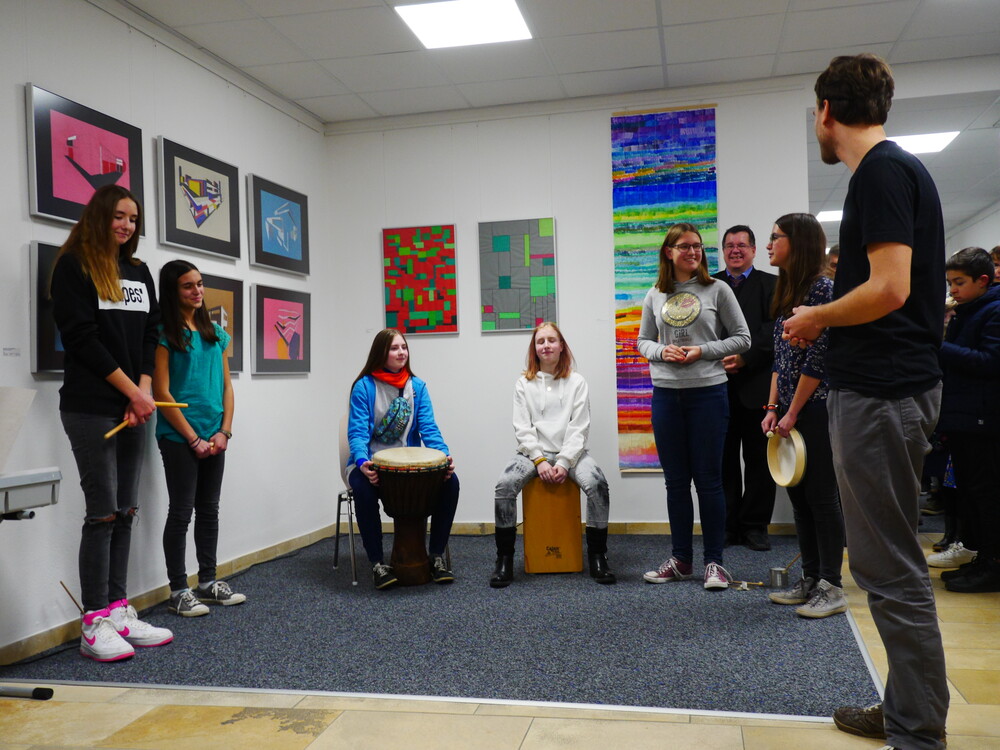 Die wissenschaftliche Mitarbeiterin aus dem Projekt "Mensch in Bewegung", Anna Beke, erläuterte, dass auch der Tanz im Bauhaus eine wichtige Rolle gespielt habe. Drei Schülerinnen zeigten die unter ihrer Anleitung einstudierte Performance "Formverliebt", die sich auf die drei Grundformen und drei Grundfarben bezog. Als weiteres Rahmenprogramm spielten Mitglieder des Orchesters des Willibald-Gymnasiums unter der Leitung von Barbara Rank ein Stück aus der "Kunst der Fuge" des Bauhaus-Idols Johann Sebastian Bach. Schülerinnen der Klasse 9a hatten zudem unter der Betreuung des Community-Music-Studenten Marcel Teppich ein eigenes Percussion-Stück zu den Prinzipien des Bauhauses komponiert und trugen es vor.