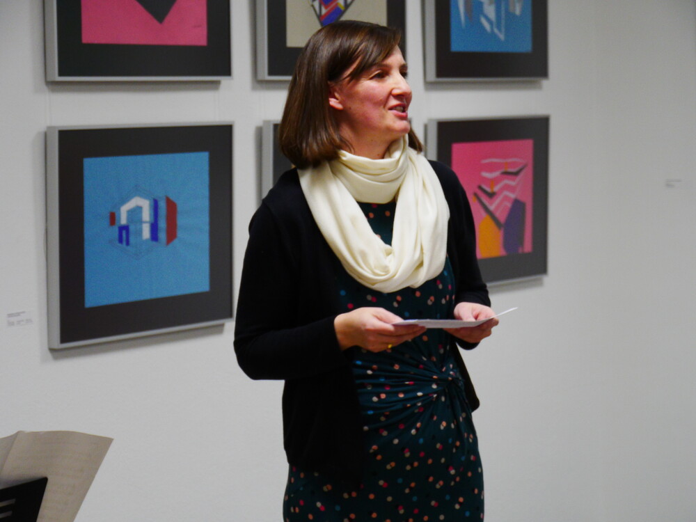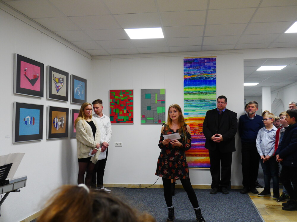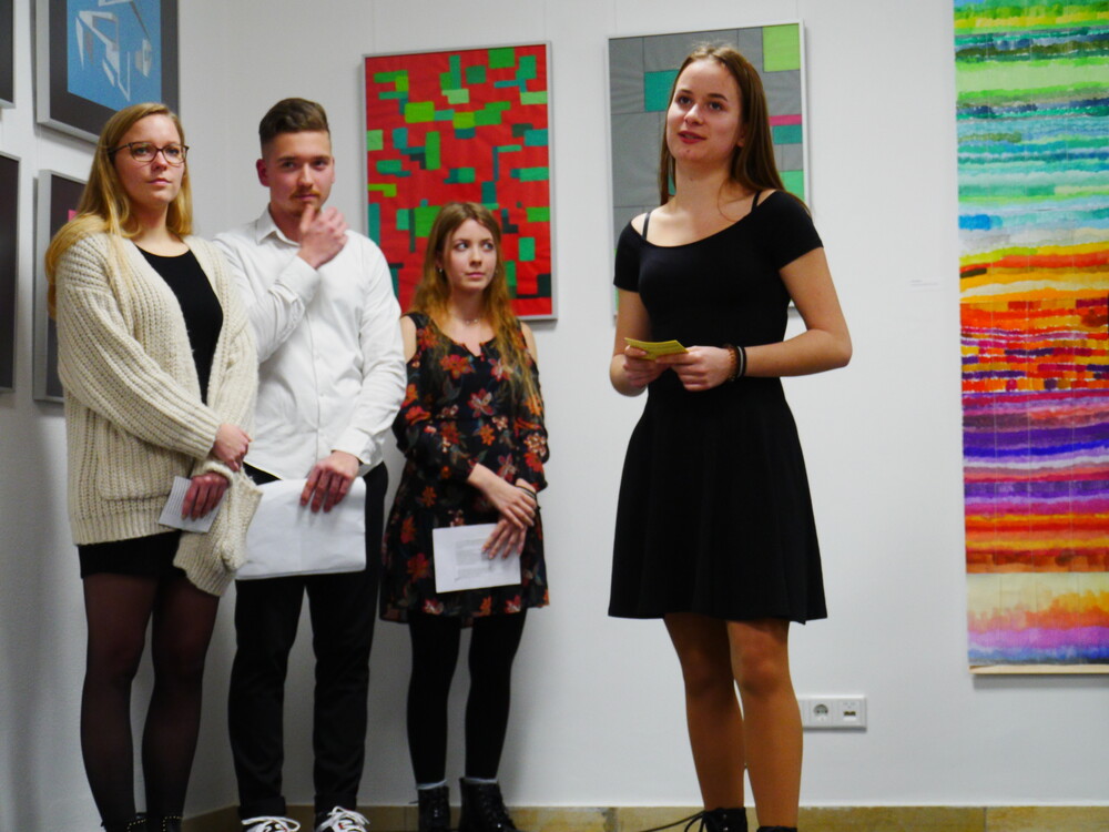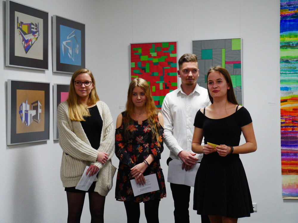 Worauf sich die ausgestellten Zeichnungen, Malereien und Skulpturen beziehen, erklärten Schülerinnen und Schüler der 12. Klasse den anwesenden Gästen in einer kurzen Einführung in die Geschichte des Bauhauses. Papiermodelle der 7. Klassen beziehen sich beispielsweise auf Architektur von Ludwig Mies van der Rohe, andere Werke haben Johannes Ittens Farblehre oder einen Bildaufbau nach Wassily Kandinsky zum Vorbild. Die Aufgabe der Kunstvermittlung gehörte ebenfalls zu dem Projekt, das auf dem Prinzip des "Service Learning" (Lernen durch Engagement) beruht. Durch eigenen Einsatz sollte den Beteiligten ein tieferer Zugang zu dem Thema ermöglicht werden. In Arbeitsgruppen erarbeiteten die Schülerinnen und Schüler die Inhalte, ein Moderatorenteam trug die Einführung in die Werke dem Publikum vor. Ob dieser Herausforderung seien sie zunächst skeptisch gewesen, verrieten die Zwölftklässlerinnen Annika Hamilton, Annika Dieg und Laura Möndel, die als Moderatorinnen im Einsatz waren. Die gute Vorbereitung habe aber geholfen. "Wir haben uns gefreut, dass wir das direkt an die Besucher weitergeben können", sagten sie, "das war ein tolles Erlebnis".