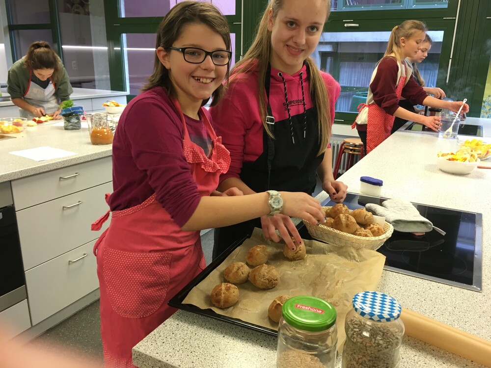 Das Wahlfach „Kochen“ fand auch in diesem Jahr wieder begeisterte Anhänger. Mädchen und Jungen aus der 7. Jahrgangsstufe hatten an drei Freitag-Nachmittagen die Gelegenheit, ihre Kenntnisse zu vertiefen. Jeweils von 13.15 bis 15.30 Uhr betreute Bettina Mühlbauer , die als hauswirtschaftliche Betriebsleiterin über das nötige Fachwissen verfügt, diesen Kurs. Die Rezepte wurden besprochen und die Arbeitsabläufe erklärt. Das Schnippeln für die Gemüsesuppe und den Obstsalat erfordert bestimmte Techniken. Aber auch ein Schnitzel braten will gekonnt sein. Viel Kreativität zeigten die Teilnehmer auch beim Formen der Semmeln.