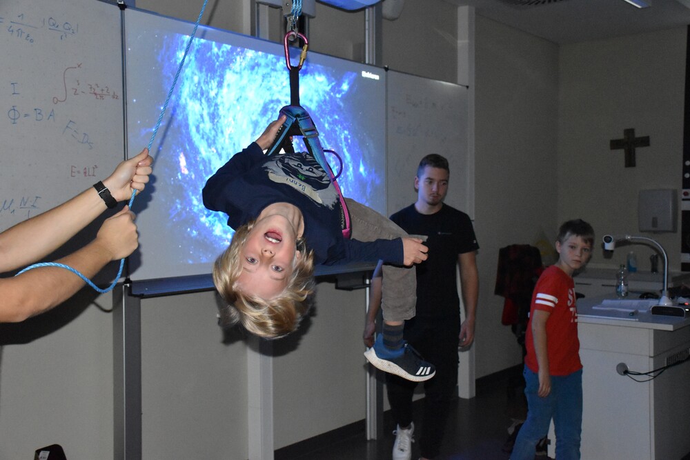 Nach endgültigen Vorbereitungen und dem Versenden der Einladungen, war es am 12. Oktober endlich so weit. Das WG öffnete an diesem Samstag seine Türen für 36 Mädchen und Jungen aus der vierten Klasse, mit denen wir einen heiteren und informativen Vormittag verbrachten. Das Starten einer Wasserrakete, Essen echter Astronautennahrung und die Simulation der Schwerelosigkeit mit einem Seilzug kamen bei den Grundschulkindern ausnahmslos gut an. Auf unsere abschließende Frage, ob sie Spaß hatten und etwas lernen konnten, war ein lautstarkes „Ja“ von allen Beteiligten zu hören. Aber auch wir Organisatoren hatten eine gute Zeit und können von dieser Erfahrung viel mitnehmen.