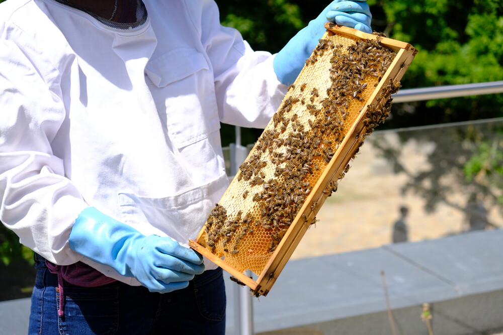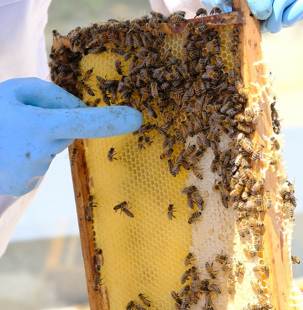 Im Mai zog das erste Schulbienenvolk auf der Biologiedachterrasse ein und wird seitdem von Schülerinnen und Schülern unter der Anleitung von Frau Kreuzer betreut! Schon bei der ersten Durchsicht konnte die Königin gefunden werden, die in den nächsten Monaten täglich bis zu 3000 Eier legt und so für den Aufbau eines stabilen und starken Bienenstaates sorgt.