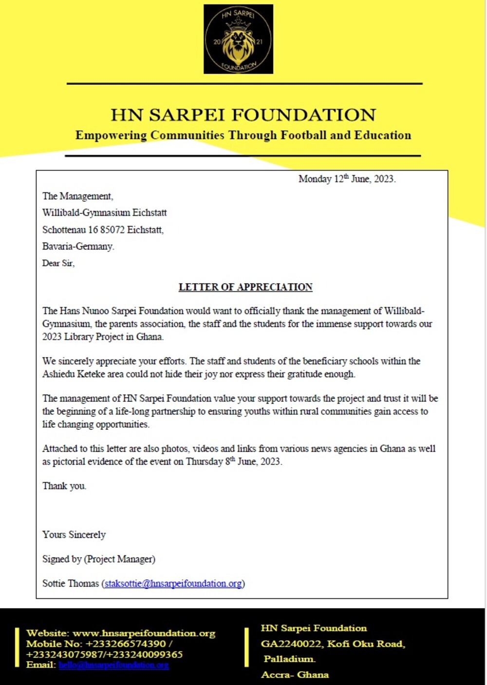 Dankesbrief der Hans-Nunoo-Sarpei-Foundation