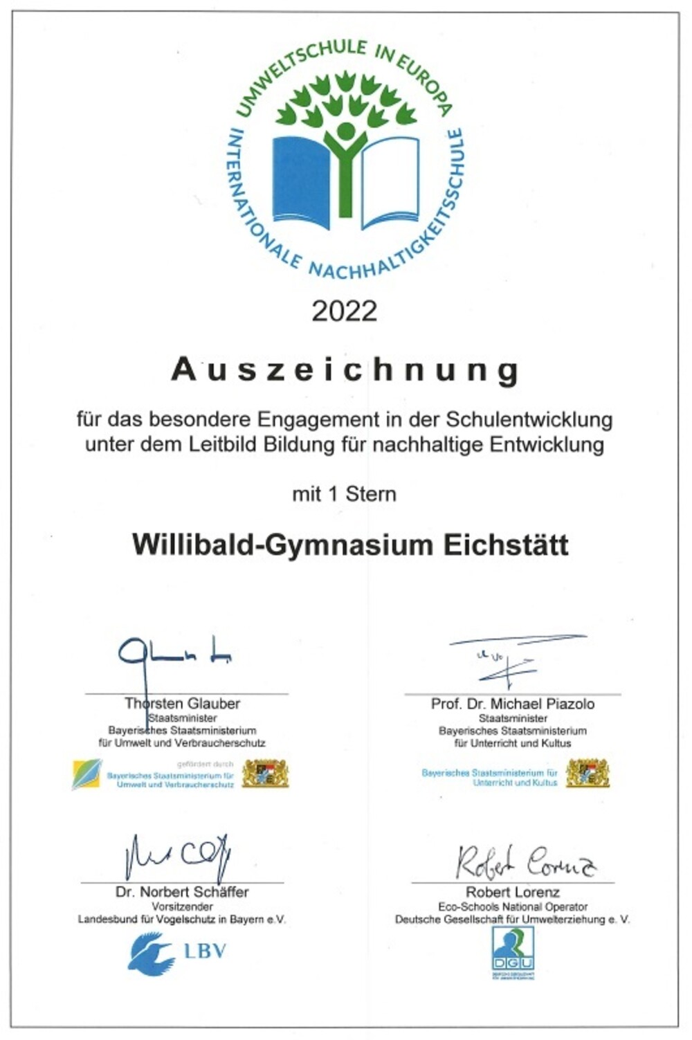 Das Willibald-Gymnasium wird als Umweltschule ausgezeichnet.