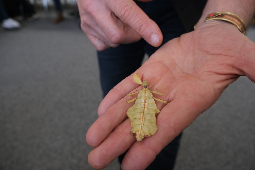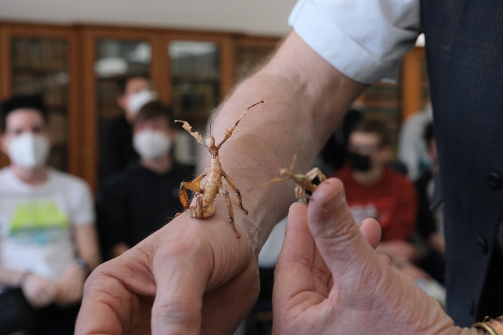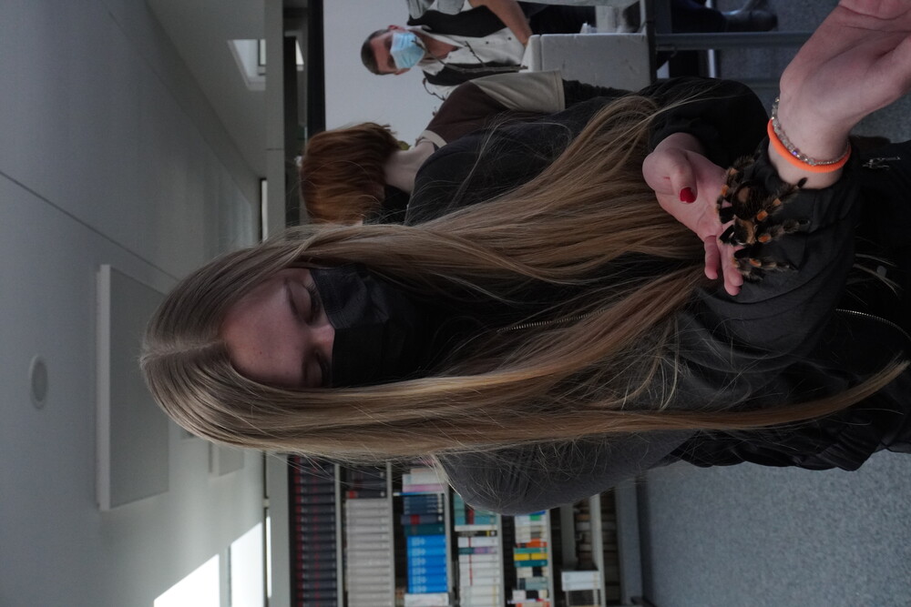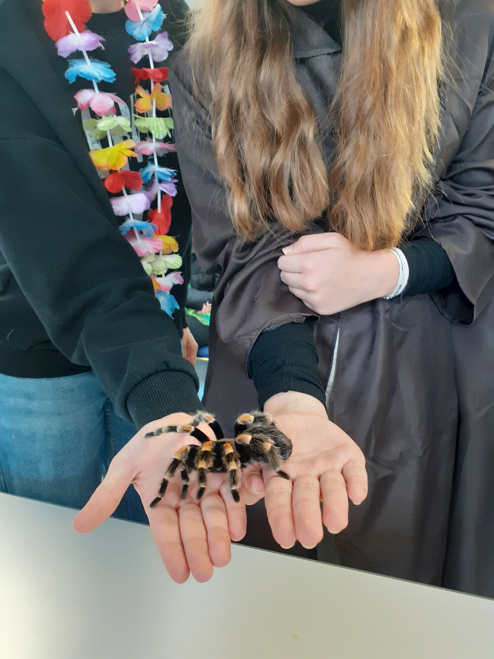 Dabei erzählte der Fachmann Wissenswertes zu jedem Tier: natürlicher Lebensraum und Aufgaben der Insekten sowie Gefährdung der Biodiversität durch den Menschen, Körperbau und Ernährung, Strategien zum Überleben, wie Tarnung oder Giftigkeit, und artgerechte Haltung als „Haustier“. In seiner unterhaltsamen und kompetenten Art gelang es Herrn Werdan, die Schülerinnen und Schüler aktiv in den Vortrag einzubinden, sie für die Tiere zu begeistern und ihnen die Scheu oder gar Angst vor den Gliederfüßern zu nehmen. So trauten sich viele zum Abschluss des Vortrags, die Tiere anzufassen oder sogar auf der Hand zu halten, während Mitschüler Erinnerungsfotos schossen.
