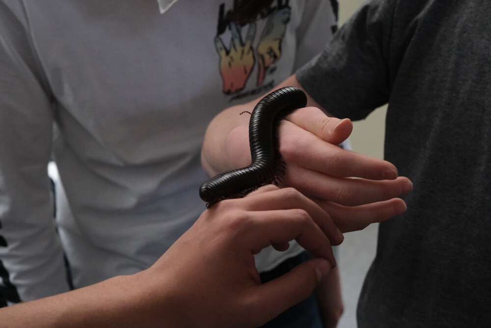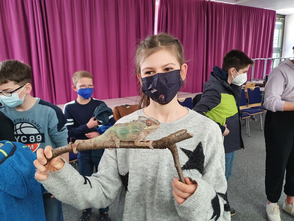 Passend zum Lehrplan standen dabei für die 9. Klassen die Wirbellosen und für die 6. Klassen die Reptilien im Mittelpunkt. Von der aufwendigen Haltung bis hin zu Besonderheiten einzelner Arten im Körperbau oder ihrer Lebensweise konnten die Schülerinnen und Schüler vieles erfahren, was nur ein echter Fachmann erzählen kann. Dabei konnten die Kinder viele Tiere auch vorsichtig berühren und eventuell vorhandene Ängste abbauen.