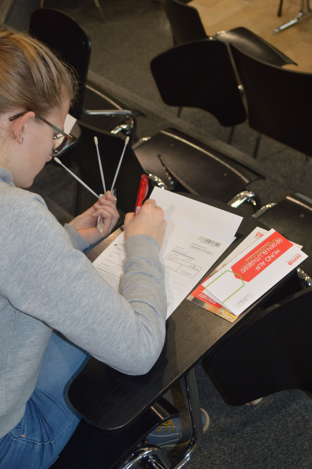 Aufgrund von Corona konnten zwar keine physischen Typisierungsaktionen in der Schule stattfinden, jedoch bot die DKMS die Möglichkeit, ein Registrierungsset ganz bequem mit nach Hause zu nehmen, um dort einen kontaktlosen Abstrich durchzuführen.