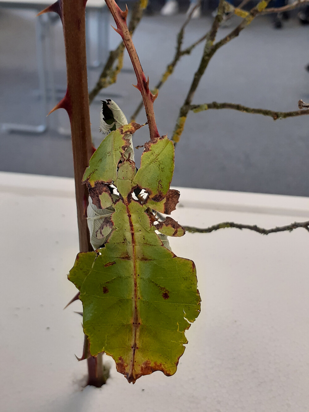 Das wandelnde Blatt, ein Insekt, das täuschend einem Blatt ähnelt, welches von einer Raupe angefressen wurde.