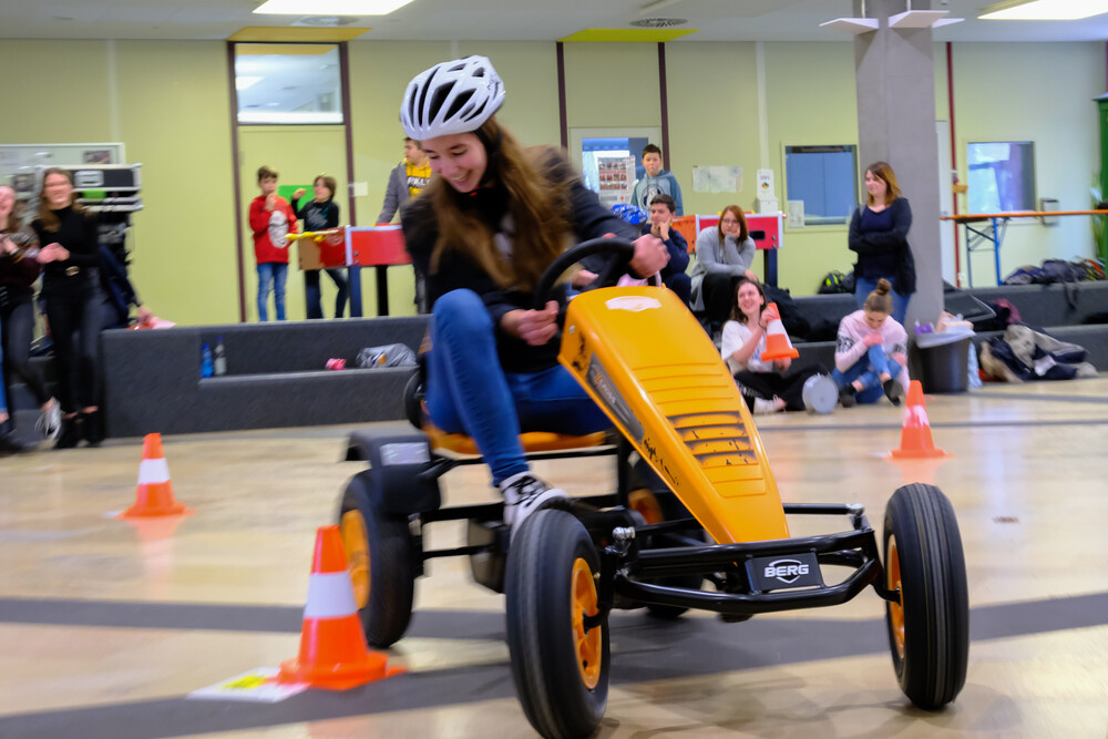 Nach diesem sehr intensiven Vormittag, erlebten die Schülerinnen und Schüler nachmittags aktiv an verschiedenen Stationen, dass ein berauschter Zustand auch immer ein zusätzliches Auffassungsdefizit verursacht. So erfuhren die 9tklässler beispielsweise beim Slalom-Go-Kart-Parcour die Folgen der Ablenkung durch die Handynutzung oder beim Alkoholsimulationstest die Reaktionseinschränkungen aufgrund des Alkoholkonsums. Auch beim Rauschbrillenparcour erlebten die Jugendlichen deutliche Wahrnehmungsdefizite im Vergleich zum „nüchternen“ Zustand.