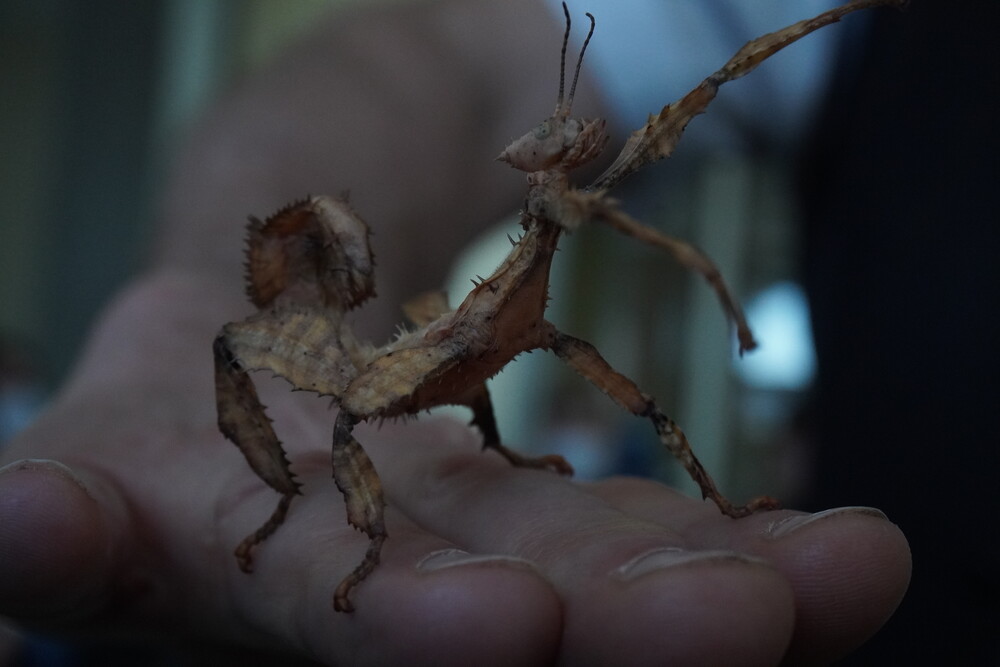 Die Gottesanbeterin, die ihre Vorderbeine so angelegt hat, als ob sie beten würde, daher ihr Name. Dass sie außerdem ihren Geschlechtspartner während des Aktes bei lebendigem Leib verspeist, faszinierte alle.