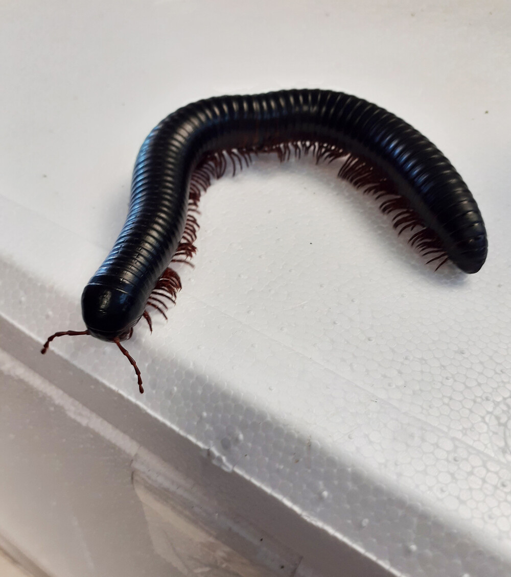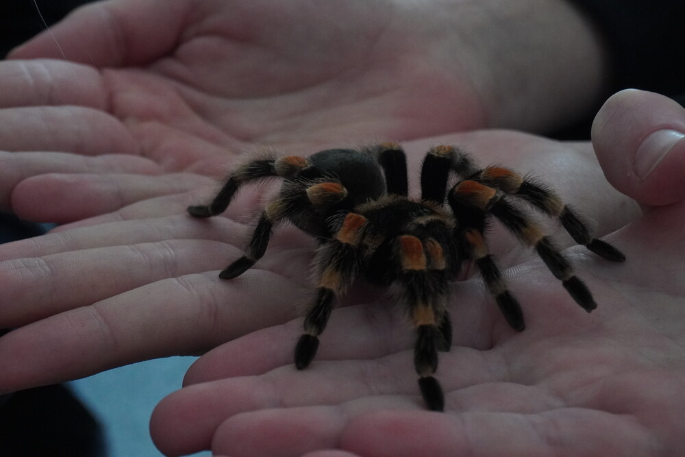 Und schließlich „Frau Schmith“, die Vogelspinne (Brachypelma smith), sie streift bei Gefahr mit den hinteren Laufbeinen die Brennhaare auf dem Hinterleib ab und schleudert sie dem Angreifer entgegen.