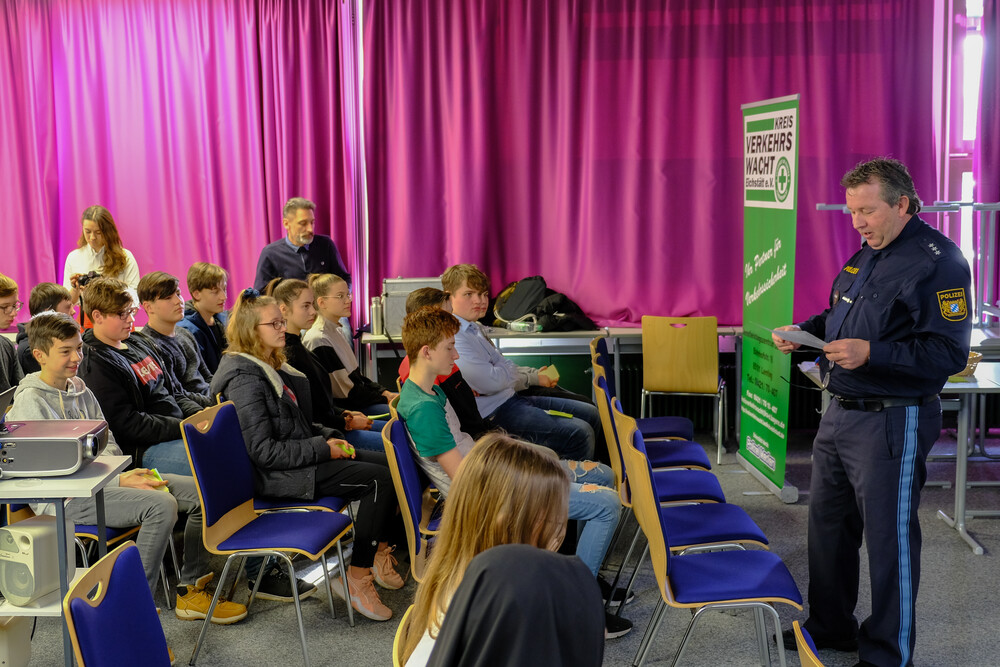 Den Auftakt des Vormittages machte Herr Wein von der Polizeidirektion Eichstätt mit seinem Vortrag zum Thema Alkohol und seine Folgen. Anschließend schilderte Herr Münzner von der Polizeidirektion Ingolstadt sehr eindringlich die Folgen des Cannabiskonsums. „ Am Anfang ist die Droge geil und berauschend! Niemand nimmt anfangs Drogen, weil man sich schlecht fühlt oder es einem schlecht geht!“ erläutert Herr Münzner. Aber schon nach kurzer Zeit verändert sich der Konsument. Er schottet sich von seiner Umwelt ab, Freundschaften werden nicht mehr gepflegt, Gleichgültigkeit und Lustlosigkeit gegenüber vorher gepflegten Hobbies und Aktivitäten machen sich breit, alles dreht sich nur noch um die Sucht und den Kick. „Man suchtelt nur noch in den eigenen vier Wänden und merkt nix mehr um sich herum“ erklärt Herr Münzner. Auch auf verschiedene synthetische Drogen wie Ecstasy oder Crystal und die sogenannten Kräutermischungen ging Herr Münzner während seines Vortrages ein. Er berichtete nicht nur über die Herstellung der „Kräutermischungen“ in Betonmischern mit chemisch synthetischen Sucht- und Lösungsmitteln und anschließender Vermengung mit Kräuterabfällen, sondern auch über die Gefahr der stark unterschiedlichen Wirkungsweise. „Denn niemand weiß, welche Dosis in den abgefüllten Tütchen schlussendlich enthalten ist. Wirkt das erste Tütchen aufputschend, so kann das zweite schon einen lebensgefährlichen Kollaps bewirken“ so der Polizist. Durch seine zwanzigjährige Erfahrung im Bereich der Drogen-und Sucharbeit gelang es Herrn Münzner nicht nur sehr authentisch und lebensecht die Gefahren des Drogenkonsums zu schildern sondern auch die anschließenden Fragen der Schülerinnen und Schüler adressatengerecht und nachhaltig zu beantworten.