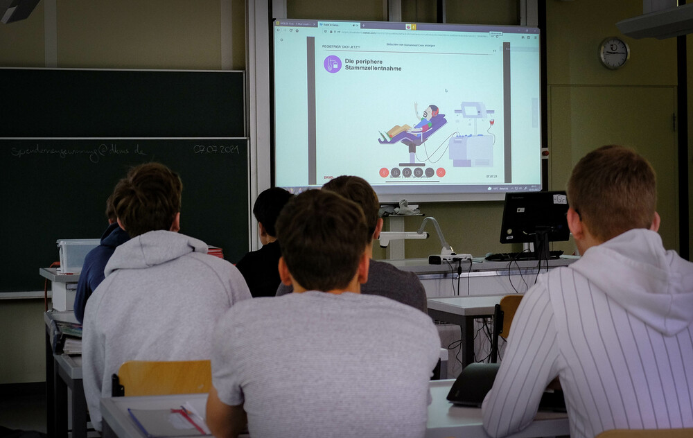 Vorab fand für alle Oberstufenschüler*innen in Form eines Onlineseminars eine Infoveranstaltung zum Thema „Blutkrebs und Stammzellspende" statt. Die Volunteers Muhammed Coban und Steinar Grässel gestalten die Veranstaltung und informierten in einem ca. 50 minütigen Vortrag die Schüler und Schülerinnen. Steinar Grässel berichtete sehr eindrucksvoll von seinen Erfahrungen als Spender und verdeutlichte, wie einfach es sein kann einem Menschen zu helfen.