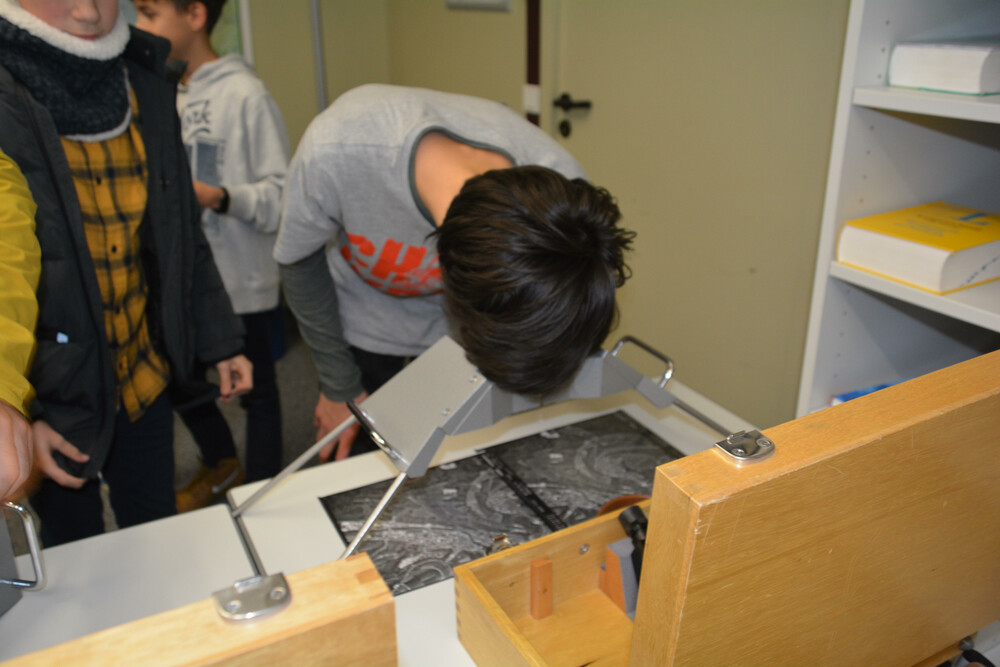 Mehrere, bereits antiquarische Stereoskope waren aufgereiht. Tief beugten sich die Schülerinnen und Schüler über die Sichtlöcher. Spiegel lenkten den Blick der Augen auf Teilbilder, in diesem Fall auf alte Aufnahmen von Eichstätt, und der Eindruck eines dreidimensionalen Stadtmodells entstand. Die Schlange war lang, keiner wollte sich das entgehen lassen.