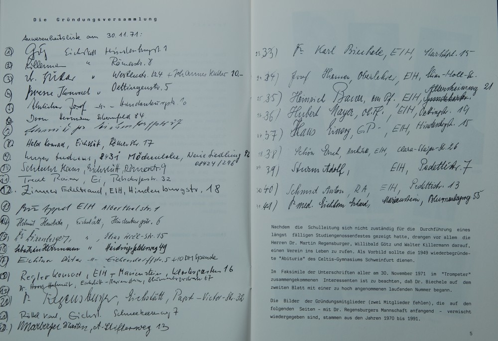 Insgesamt waren 31 Personen an der Vereinsgründung beteiligt. Die Anwesenheitsliste der Gründungsversammlung existiert noch. Wie daraus ersichtlich ist, ist auch der heutige Vorsitzende Gründungsmitglied.